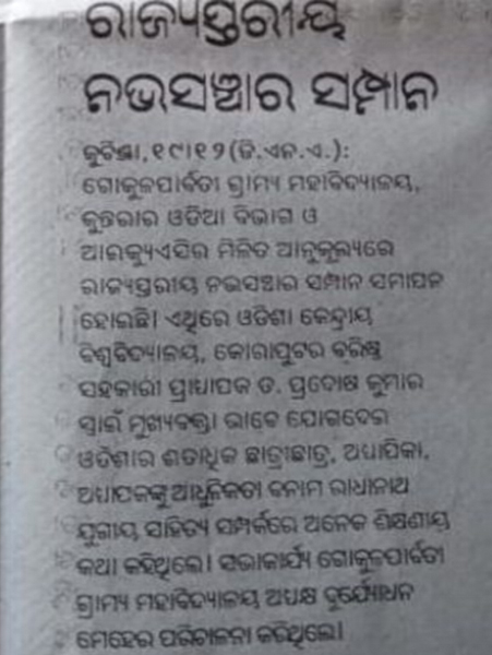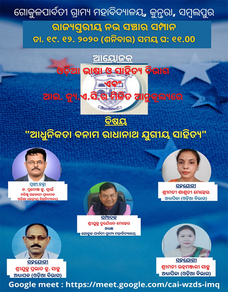 We organized a webinar topic named - "Adhunikata banana radhanath yugiya sahitya". The resource person Dr. Pradash Kumar swain delivered idea on modern odia literature and the contribution of kabibar Radhanath to wards 19th century literature. Which is also a topic we teach in our courses. The students and staff around 100 ( hundred ) participated in the webinar. The H.O.D department of odia Shaswasti Meher introduced about the resource person. Sir Prabhat sahu, Lecturer in odia conclude the webinar with vote of thanks.